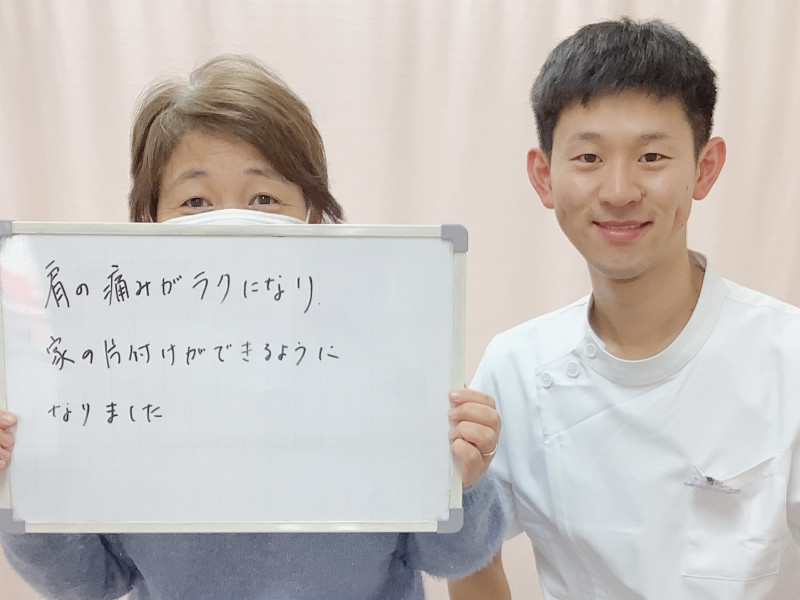 整骨院に来るのは初めてで施術を受けるまでは不安な気持ちでいっぱいでした。 整形外科では肩だけにポイントを置いたリハビリを行うのに対して、こちらではまず身体全体のバランスを整えてから肩の症状に合わせた施術を行うとの説明を丁寧にしてくださいました。 症状は痛みを取り除くだけで改善されるものではなく、身体に正常なバランスを記憶させながら施術を重ねていくと改善されていく、という最初の説明通り、施術の回数を重ねるごとに痛みが改善されていきました。 身体に不安を抱えながら日々を過ごすのは辛いものです。何事もやってみたいと分かりません。身体が元気になると心も元気になりますね!